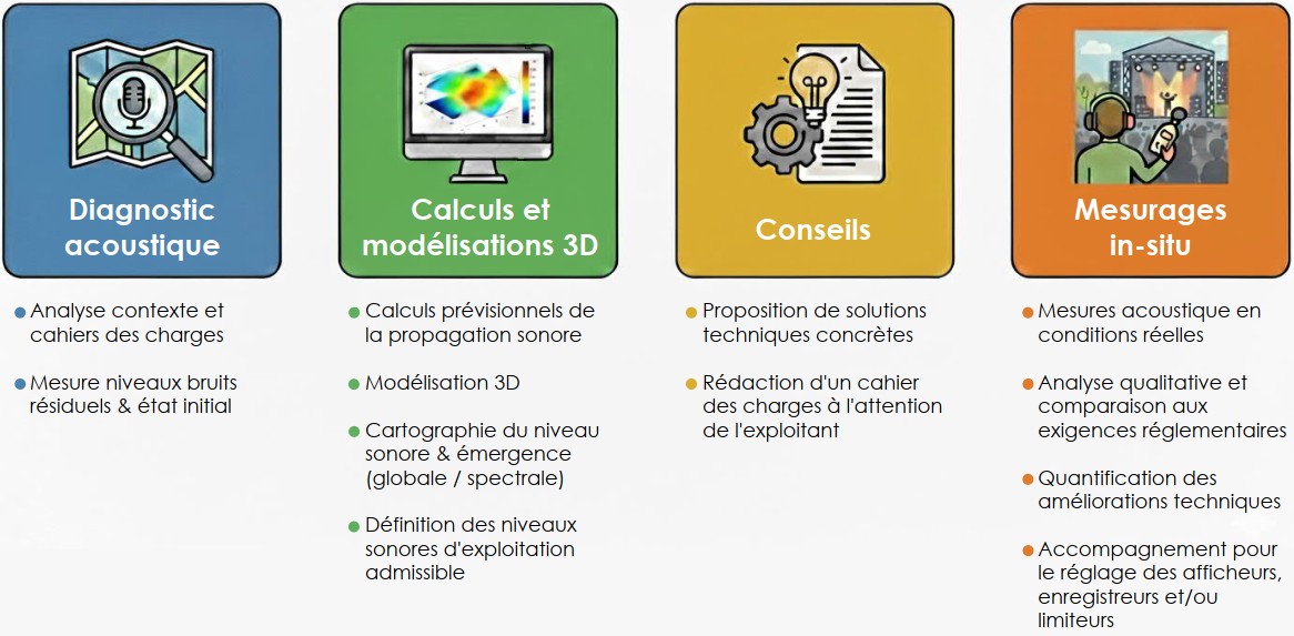 Nos interventions s’adaptent au contexte et à vos besoins, que ce soit en amont, pendant ou après un événement. Pour chaque projet, nos ingénieurs acousticiens constituent un dossier EINS sur mesure, conçu comme un outil clair, pédagogique et directement exploitable dans vos échanges avec les acteurs publics et les riverains.